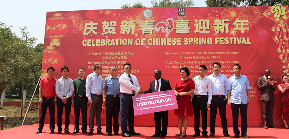 中国驻加纳大使孙保红阁下,中国驻加纳大使馆柴之京参赞,加纳华人华侨社团联合总会唐宏会长,加纳华人华侨社团联合总会副会长萧波、陈兆东、郑安,执委晏立权、陈建华、杨富海,孔子学院院长梅美莲,加纳大学附属学校校长以及其他捐助单位等相聚一堂,欢度春节。