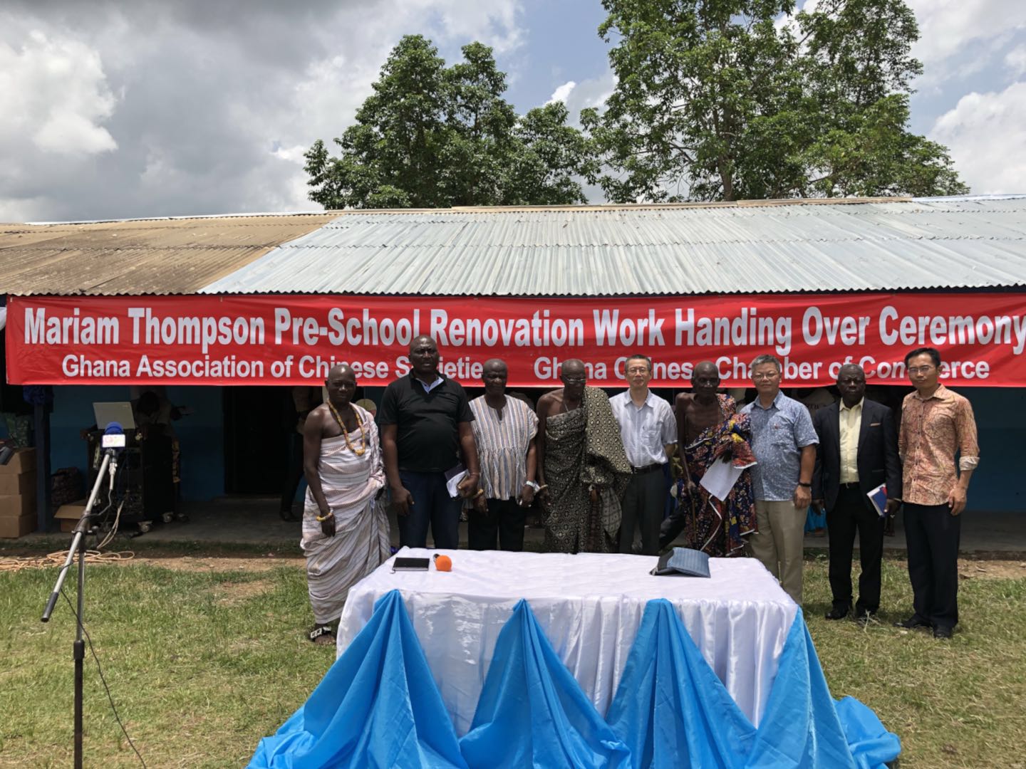 4月13号,加纳华侨华人社团联合总会到JUASO地区的Mariam Thompson Pre-School举行教室修葺竣工移交仪式。加纳华侨华人社团联合总会秘书长沈汉明、副秘书长晏立权、法律顾问杨伟强、中国驻加纳第七批医疗队的全体成员、该校全体师生及学生家长、部分本地政府官员和教育部官员等100余人员出席了此次移交仪式。同时,华联总会还特别邀请到了中国驻加纳大使馆领事部陈铭进主任。
