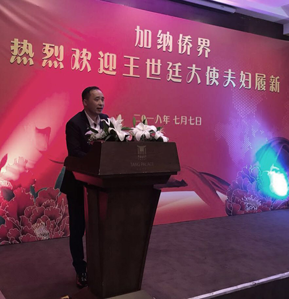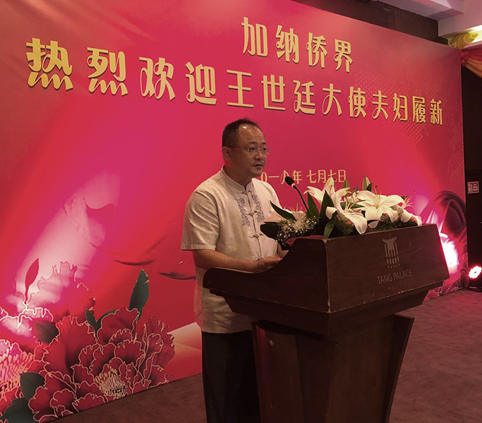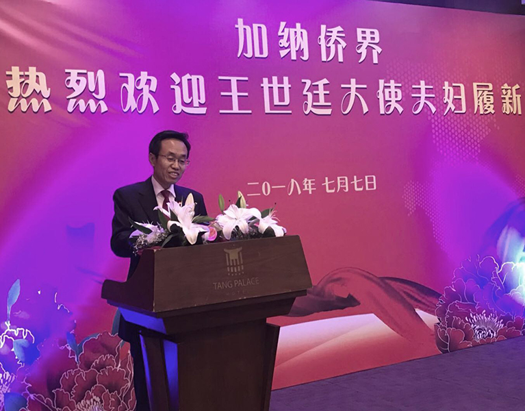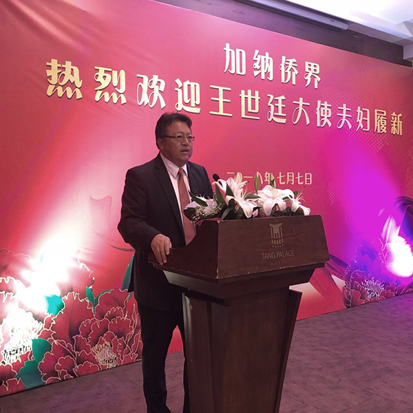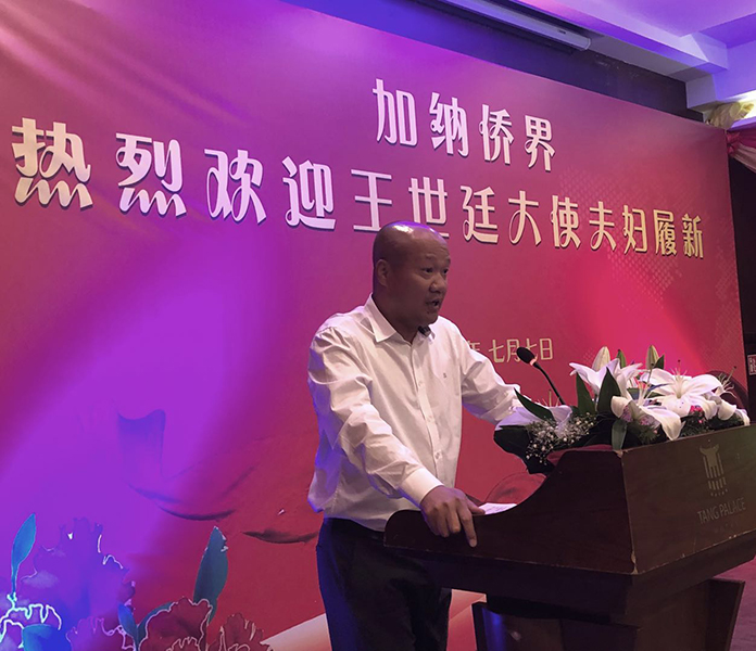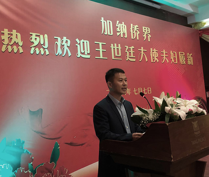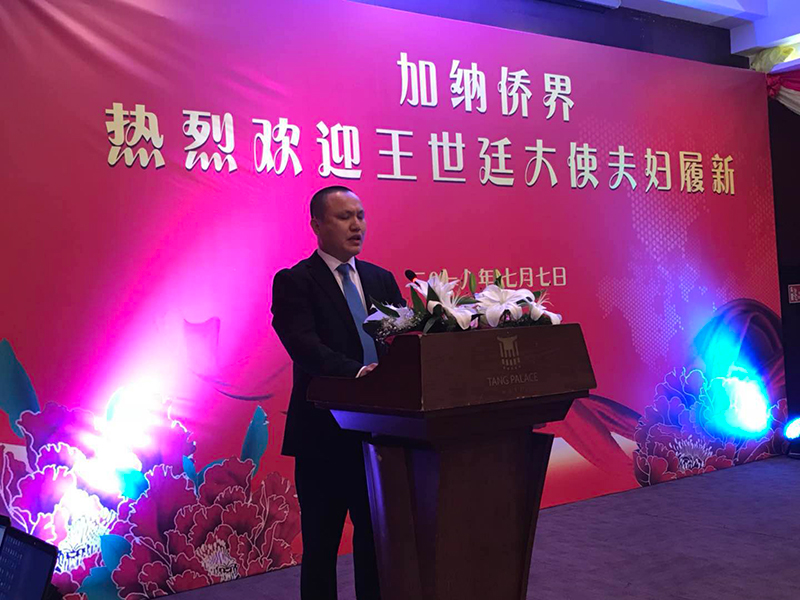 王大使的到任为中加两国友好发展翻开了新篇章。在发言中,首先对在加侨团们一直以来对使馆工作的支持表示感谢,并表示对今后中加两国友好发展充满信心。近年来中加两国关系持续深入发展,高层往来频繁,政治互信不断增加,经贸合作成果丰硕,这就给所有在加中资企业提供了新机遇。于此同时,中加关系也面临着一些挑战,但总体来讲机遇大于挑战,并对日后进一步发展充满信心。王大使在发言中也对侨团代表们提出了新要求,希望加纳侨界继续发挥顽强拼搏,艰苦创业精神,积极参与到中加两国各领域的交流合作中去,成为中加友好发展的支持者和建设者。
