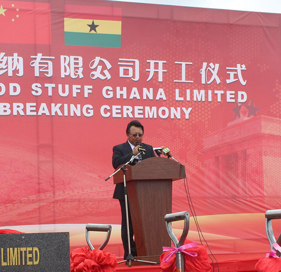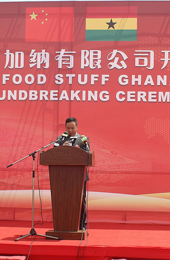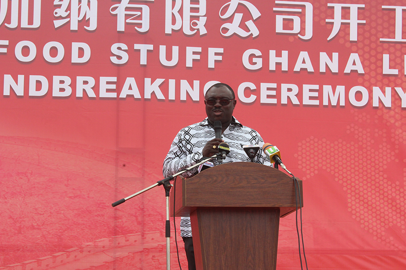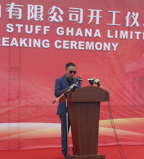 天津食品集团副总经理张军在发言中首先对给应邀前来参加本集团子公司加纳利丰食品有限公司的番茄酱奠基仪式的各位来宾表示欢迎。发言中指出,利丰食品加纳有限公司番茄酱加工生产基地建设项目开工典礼的举行,标志着该工程已进入全面快速建设阶段,根据建设规划,该项目将于2018 年12 月底建成并投入使用,时间紧迫,任务艰巨。并希望中国员工和加纳员工融洽相处,愉快工作。相信经过双方共同努力,利丰食品加纳有限公司必将成为中加合作的典范。最后,衷心地希望各参建单位和全体参建者能够精诚合作,积极工作,项目能够安全、如期、高质量地建成投产,并早日服务于加纳人民。