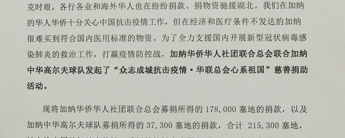 新冠肺炎疫情爆发以来,无数海外华侨华人、留学生万众一心,与祖国共克时艰。各行各业和海外华人也在纷纷捐款、捐物资驰援湖北。我们在加纳的华人华侨十分关心中国抗击疫情工作,但在经济和医疗条件不发达的加纳很难买到符合国内医用标准的物资。为了全力支援国内开展新型冠状病毒感染肺炎的救治工作,打赢疫情防控战,加纳华侨华人社团联合总会联合加纳中华高尔夫球队发起了“众志成城抗击疫情·华联总会心系祖国”慈善捐助活动。