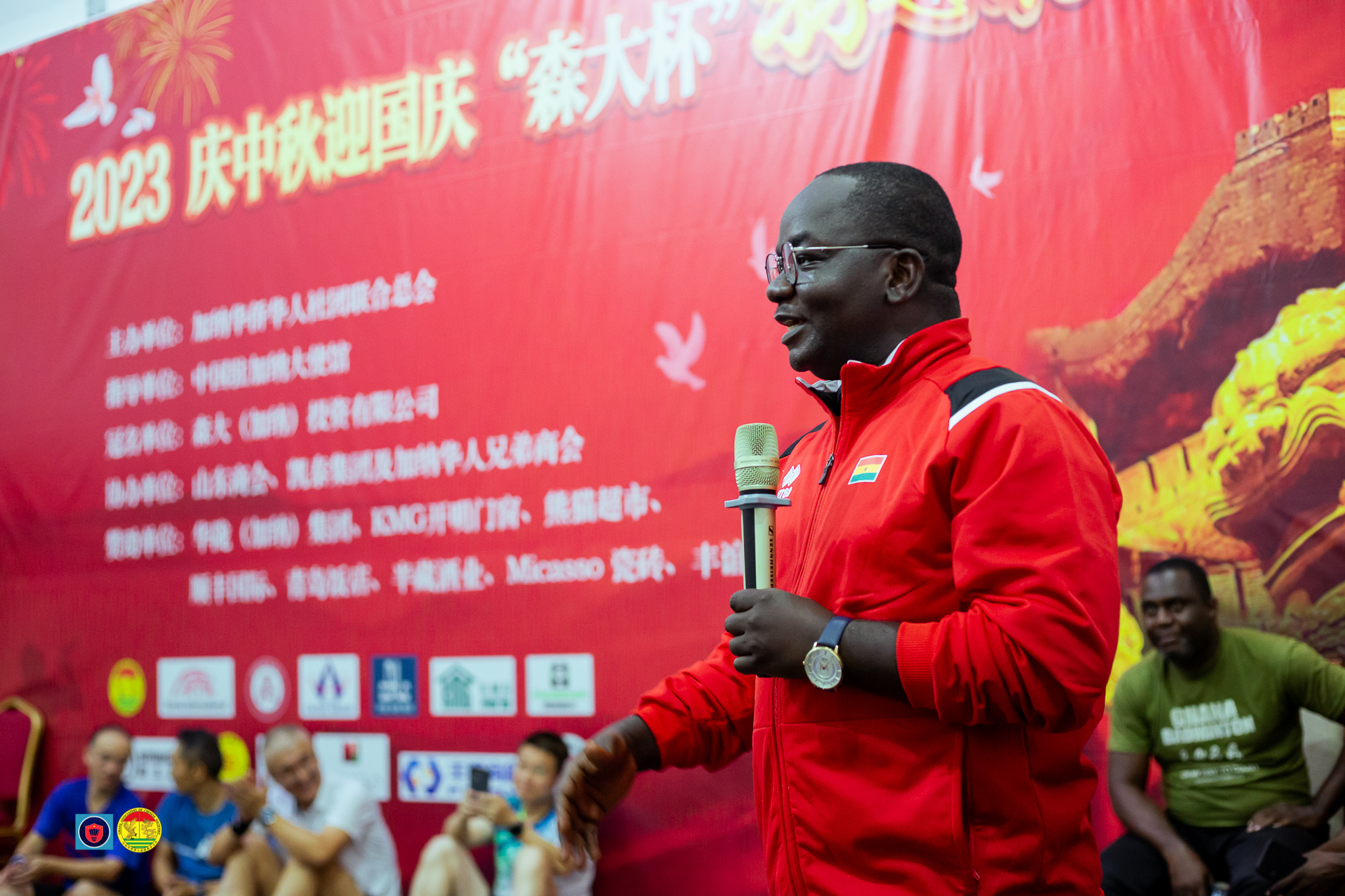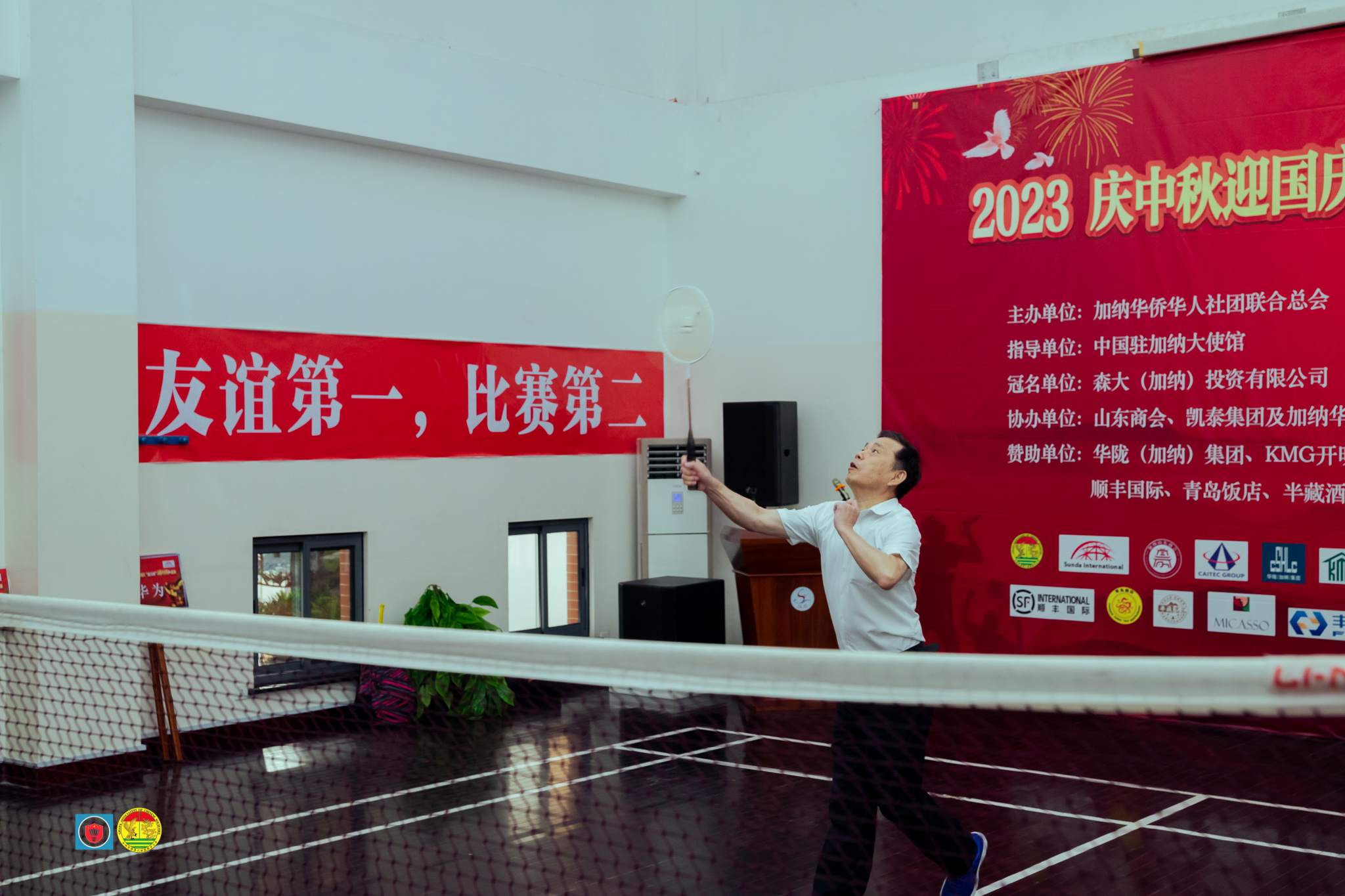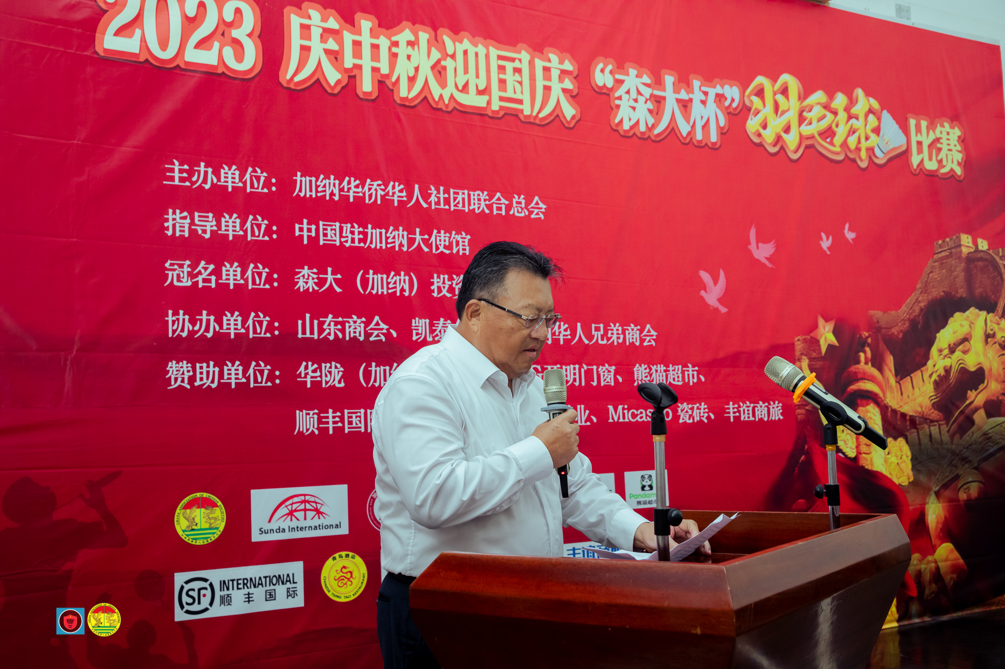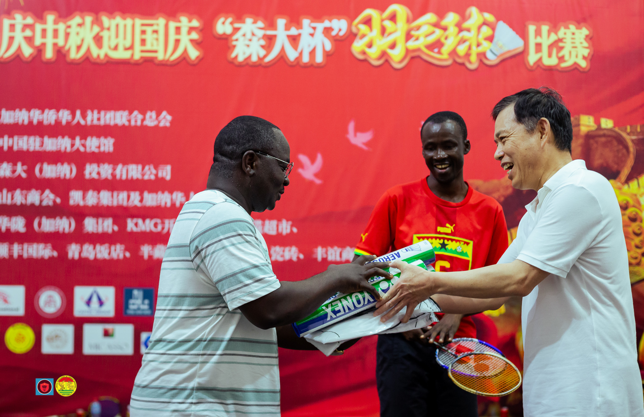 本次羽毛球联谊赛冠名单位森大(加纳)投资有限公司总经理叶炜表示,虽然和祖国远隔万里,但在加纳华侨华人社团联合总会、侨商企业以及有关侨团商会共同努力下,旅加华侨华人羽毛球爱好者得以在中秋国庆双节临近之际欢聚一堂,乐享羽毛球运动带给我们的健康和乐趣,充分感受祖国一家亲的美好氛围,意义非凡。叶总并鼓励大家赛出友谊和风格。