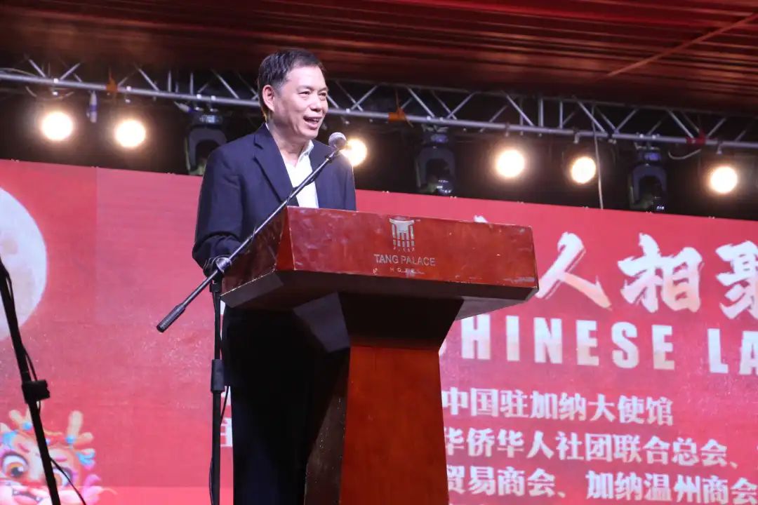 加纳华侨华人社团联合总会会长唐宏、加纳福建华人华侨工商联合总会会长许宁佺、加纳中资企业商会会长杨群分别代表活动主办方及加纳侨界、中资企业致欢迎辞并介绍了一年来各自领域的工作动态,同时表示,新的一年将继续团结带领侨团、中资企业为发展中加友好事业作贡献。加纳议长巴宾在讲话中高度评价了中国高质量发展取得的成就,强调了发展中加友好关系的重要历史和现实意义,充分肯定了广大华侨华人和中资企业为促进加中友好发挥的积极作用。