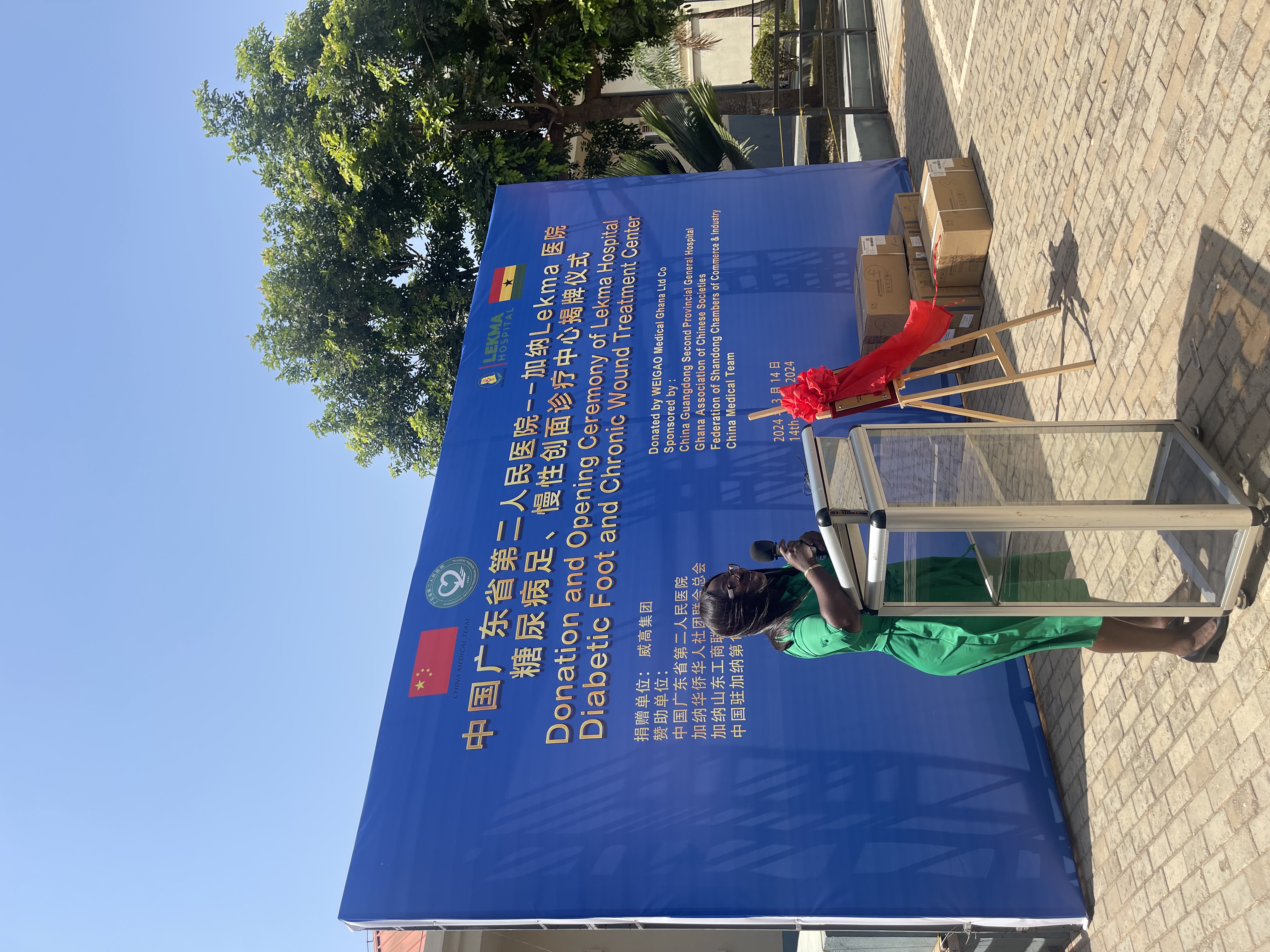 Lekma医院院长在发言中表示,十分感谢中国大使馆、中国援助加纳医疗队以及在加华人商会这些坚实的合作伙伴。这次捐赠活动以及和广东省第二人民医院合作的新增科室一定会为加纳糖尿病足和慢性创面患者带去希望。Dr. Akua还表示Lekma医院由中方援建,自2010年交付使用以来,中国援助加纳医疗队始终是医院的坚固基石,为加纳人民的健康福祉做出了巨大贡献。同时,她还感谢中国政府对加纳医疗体系的建设和完善给予的支持。