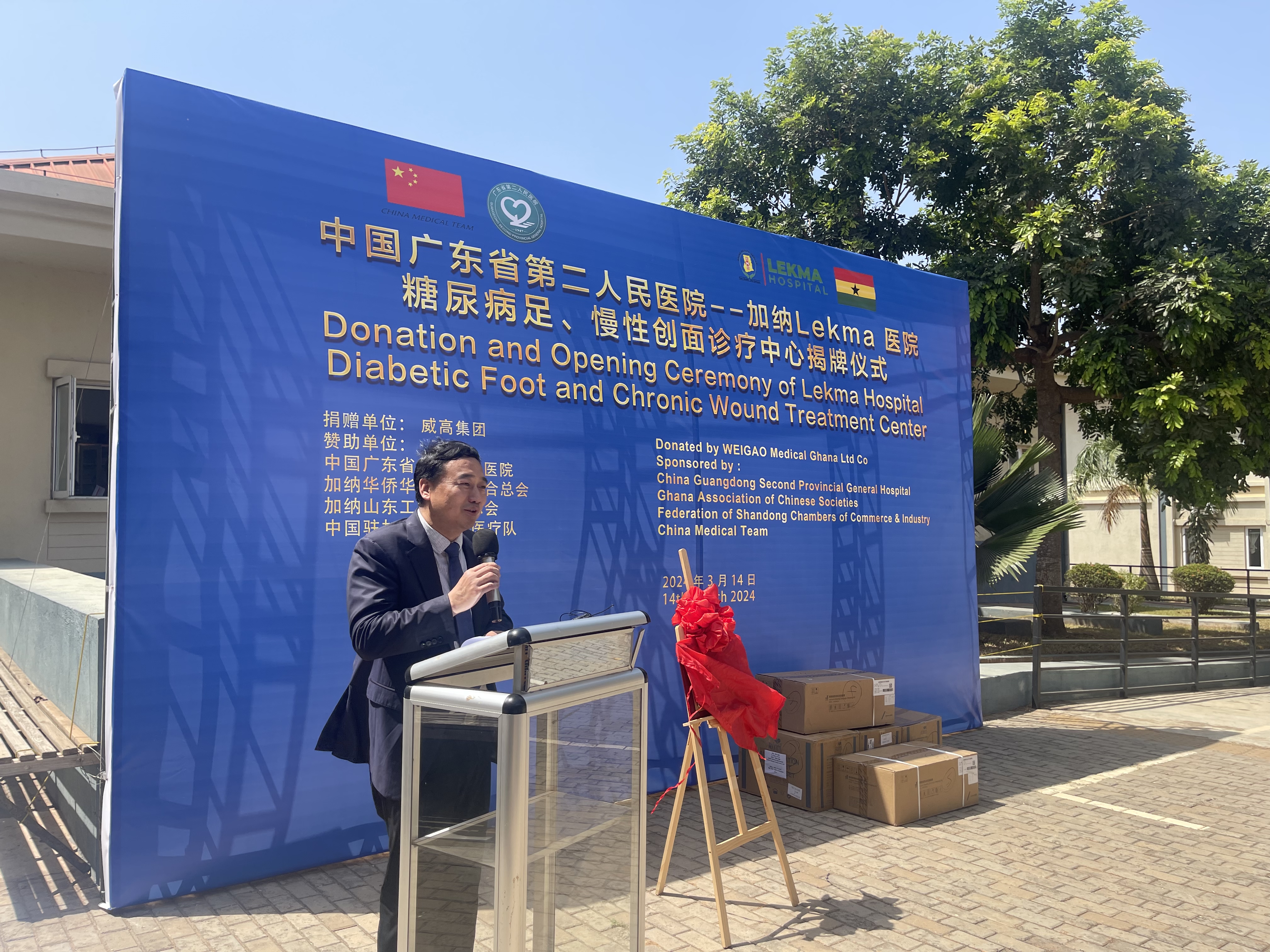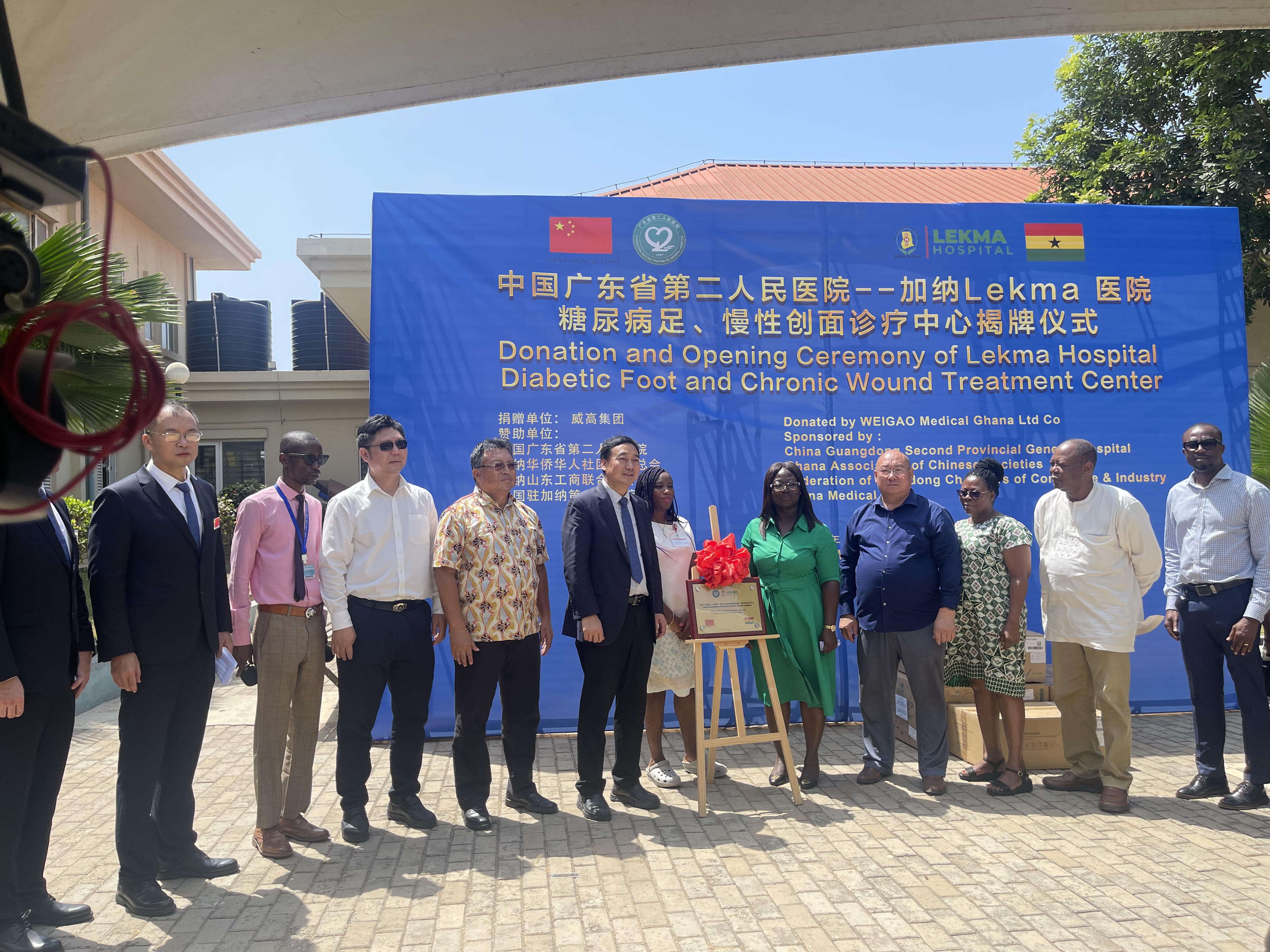 3月14日,加纳华侨华人社团联合总会,加纳山东工商联合总会携手中国广东省第二人民医院以及中国驻加纳第12批医疗队共同赞助并出席了加纳Lekma医院糖尿病足、慢性创面诊疗中心揭牌仪式。会长唐宏、副会长兼秘书长沈汉明、山东商会会长王跃、广东省第二人民医院院长瞿红鹰、副书记李文华、主任李彩虹、司彤、中国驻加纳第十二批医疗队队长杜育衫及全体成员、Lekma医院院长Dr.Akua Gyimah Asante、加纳华人资讯总经理张春元等代表,新华社、TV-3、Homebase TV、Republic News、Herald Newspaper共计5家媒体出席了此次活动。