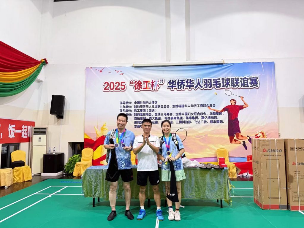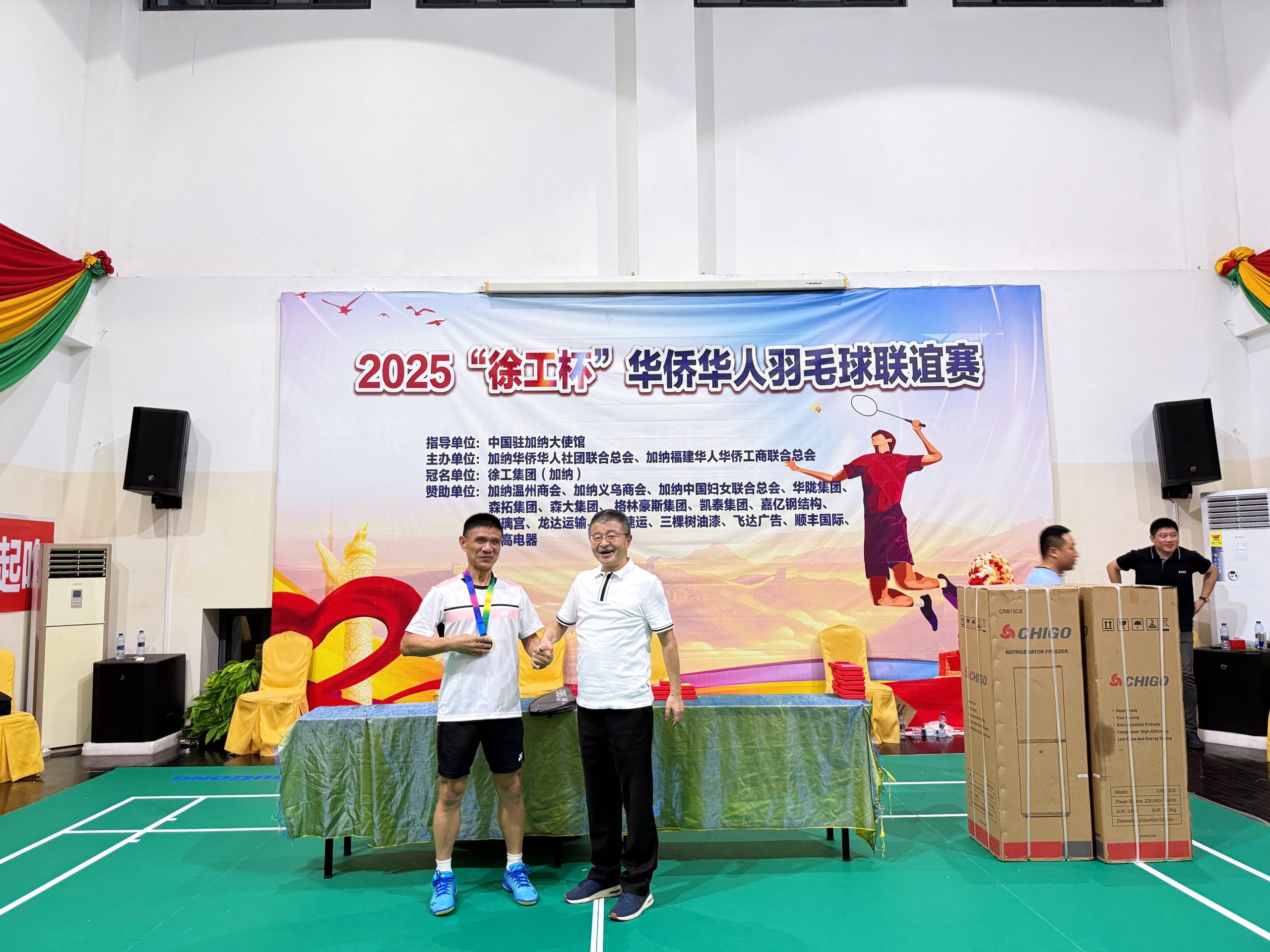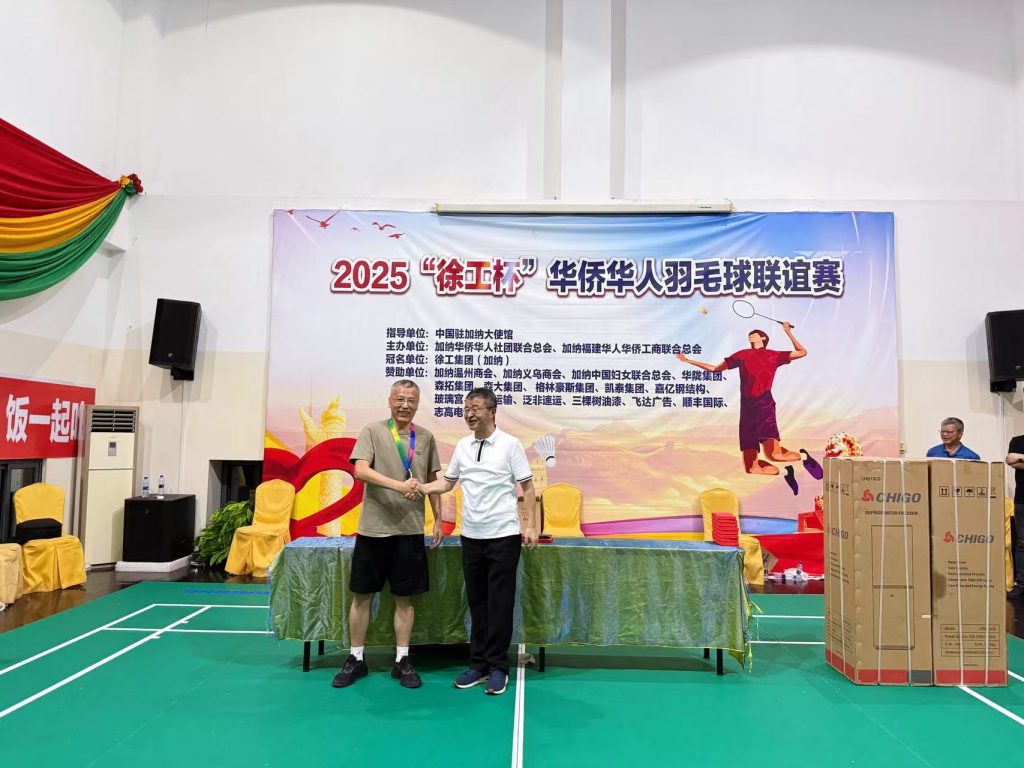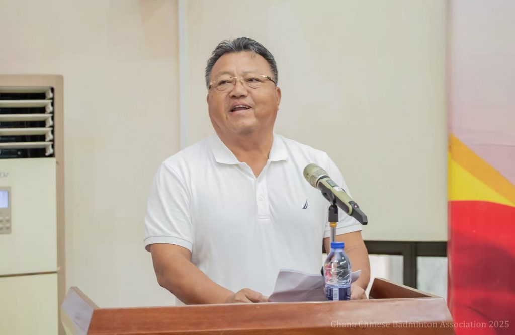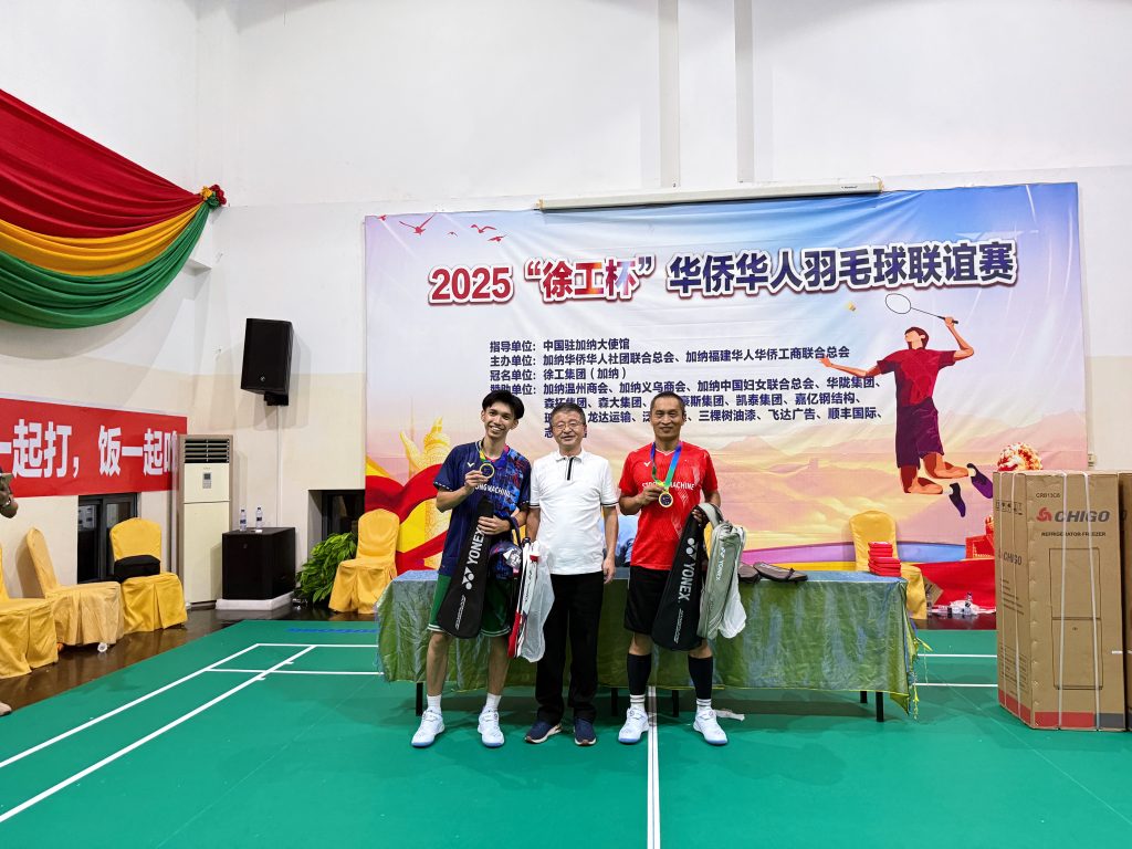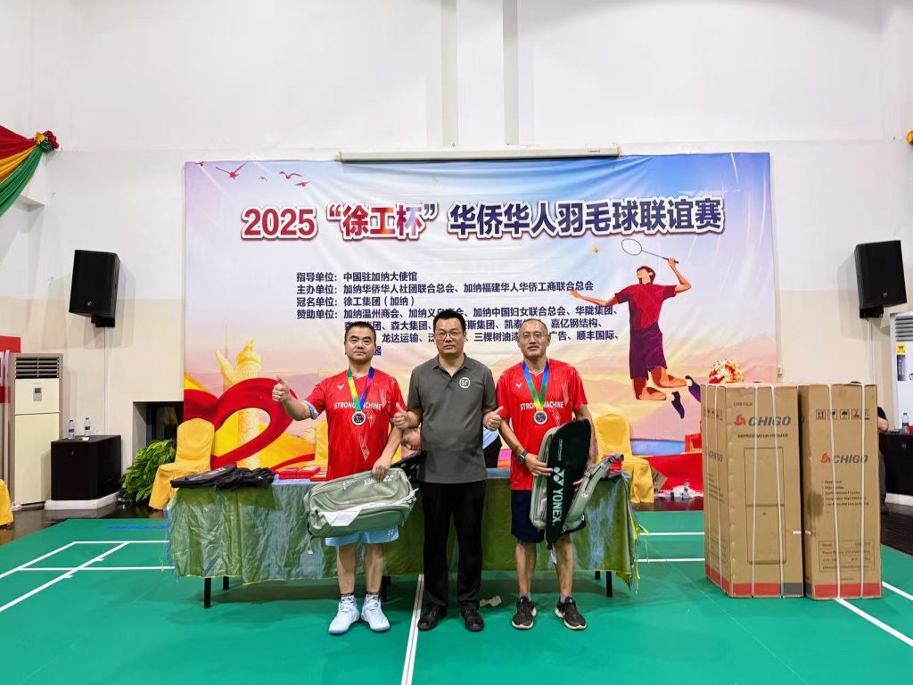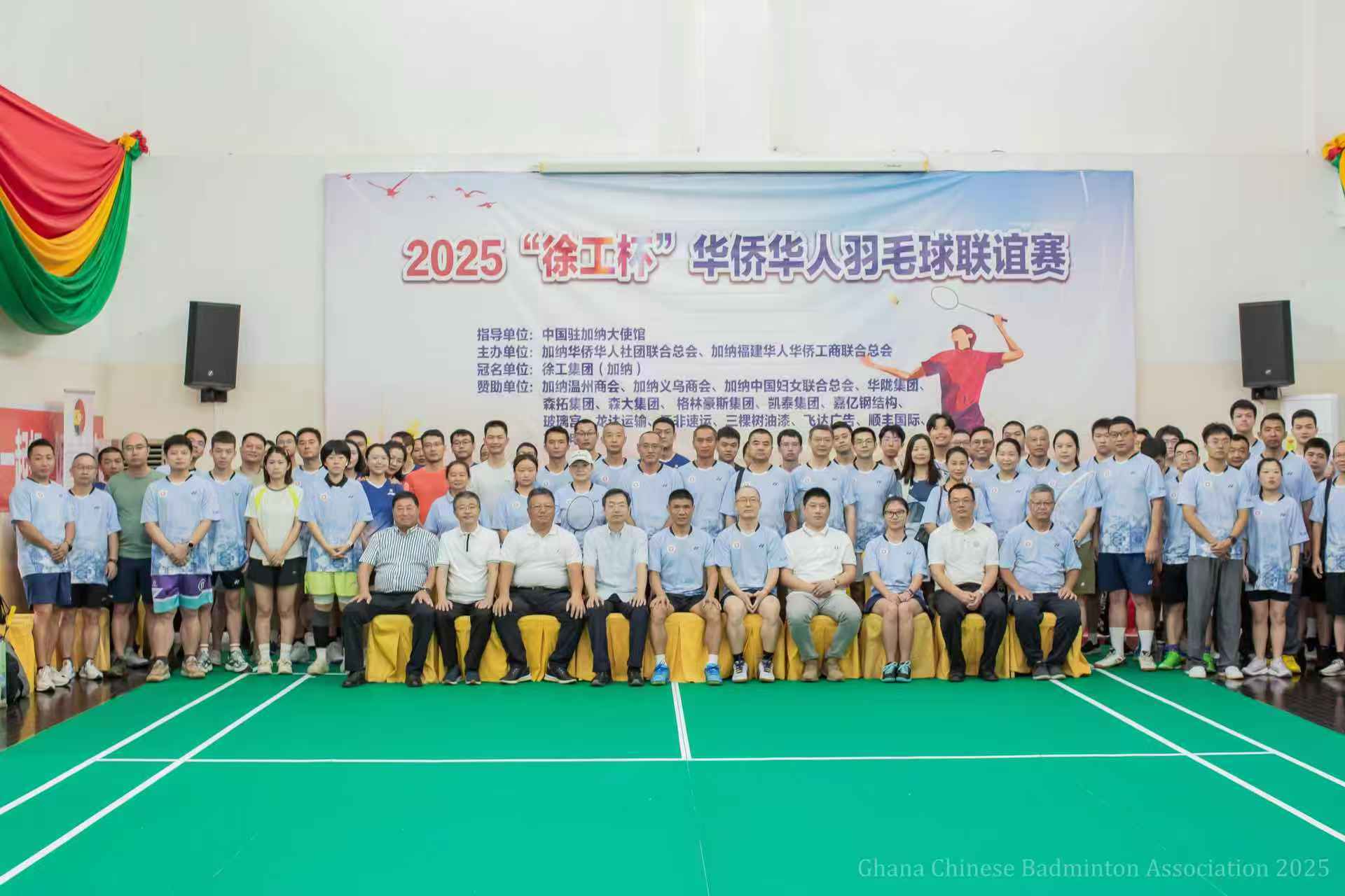 10月11日-12日,由中国驻加纳大使馆指导、加纳华侨华人社团联合总会、加纳福建华人华侨工商联合总会主办,徐工集团(加纳)冠名、其他加纳华人兄弟商会及众多侨商企业赞助的2025“徐工杯”华侨华人羽毛球联谊赛在GS Plaza Hotel成功举办。中国驻加纳使馆李旸代办,中国驻加纳使馆领事部宁军主任、加纳华侨华人社团联合总会会长唐宏,加纳福建华人华侨工商联合总会执行会长郑贤春、加纳华侨华人社团联合总会秘书长沈汉明、温州商会何妮峰、华陇(加纳)集团党总支书记、董事长、总经理贾龙、格林豪斯集团副总经理王成和、森拓钢铁周典敏、顺丰国际严松林、各企业代表队及羽毛球爱好者百余人参加比赛开幕式,中国驻加纳使馆闻付林参赞出席颁奖仪式。