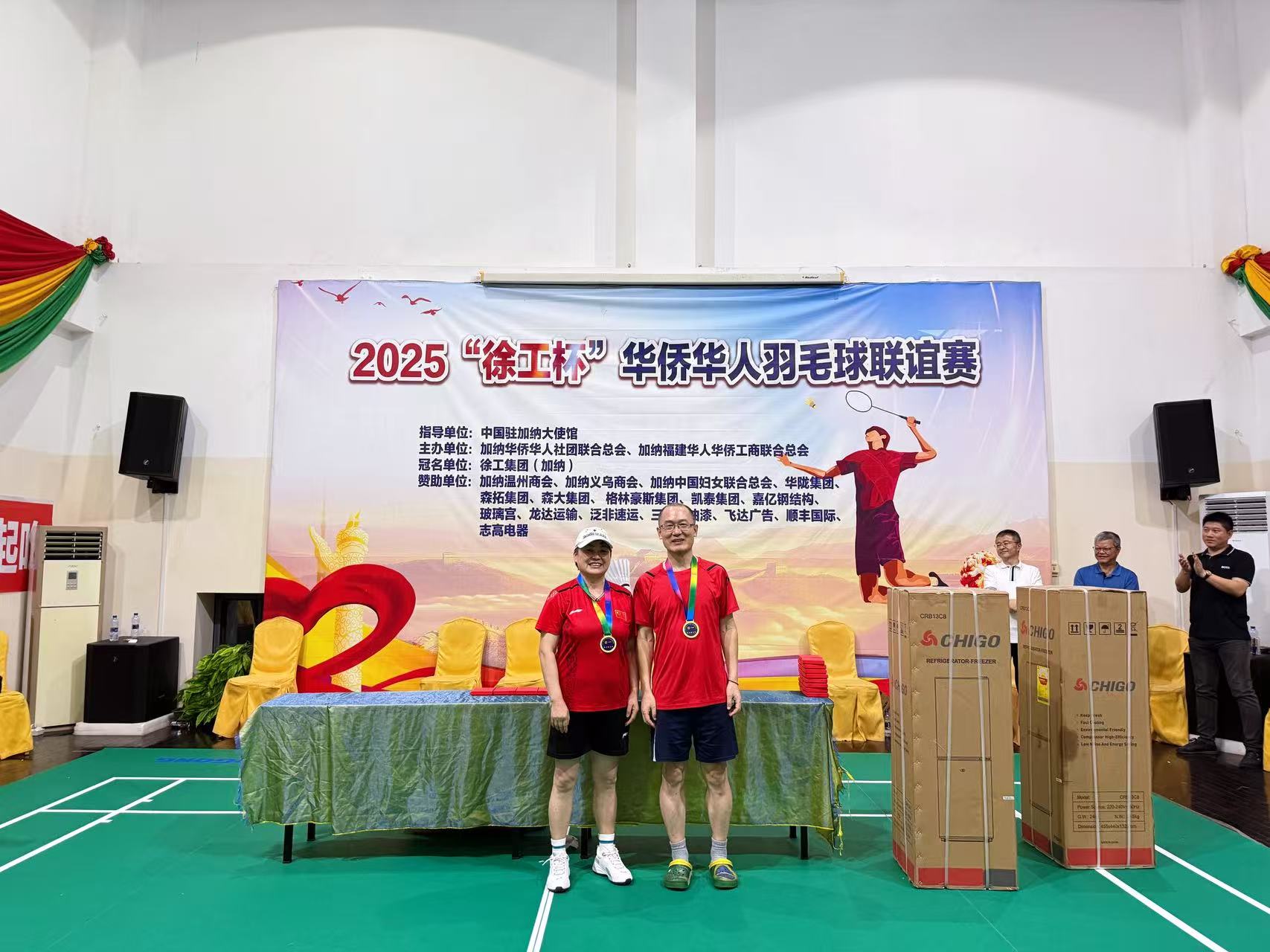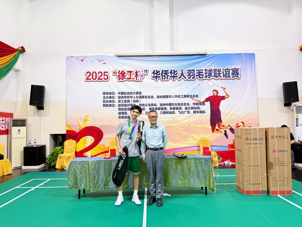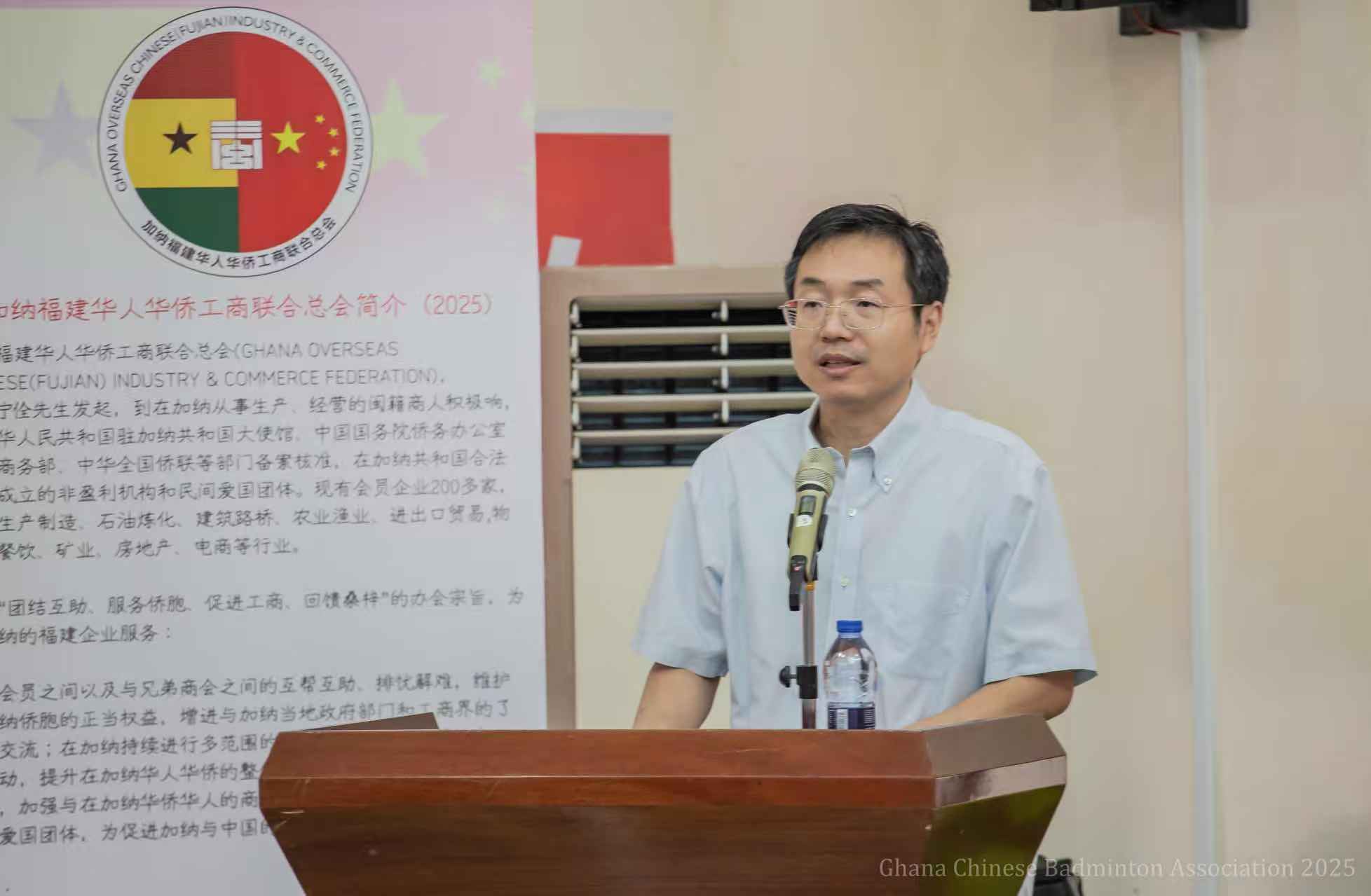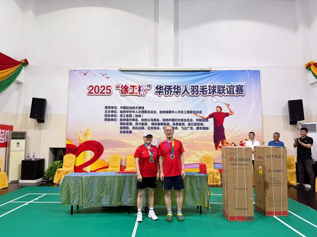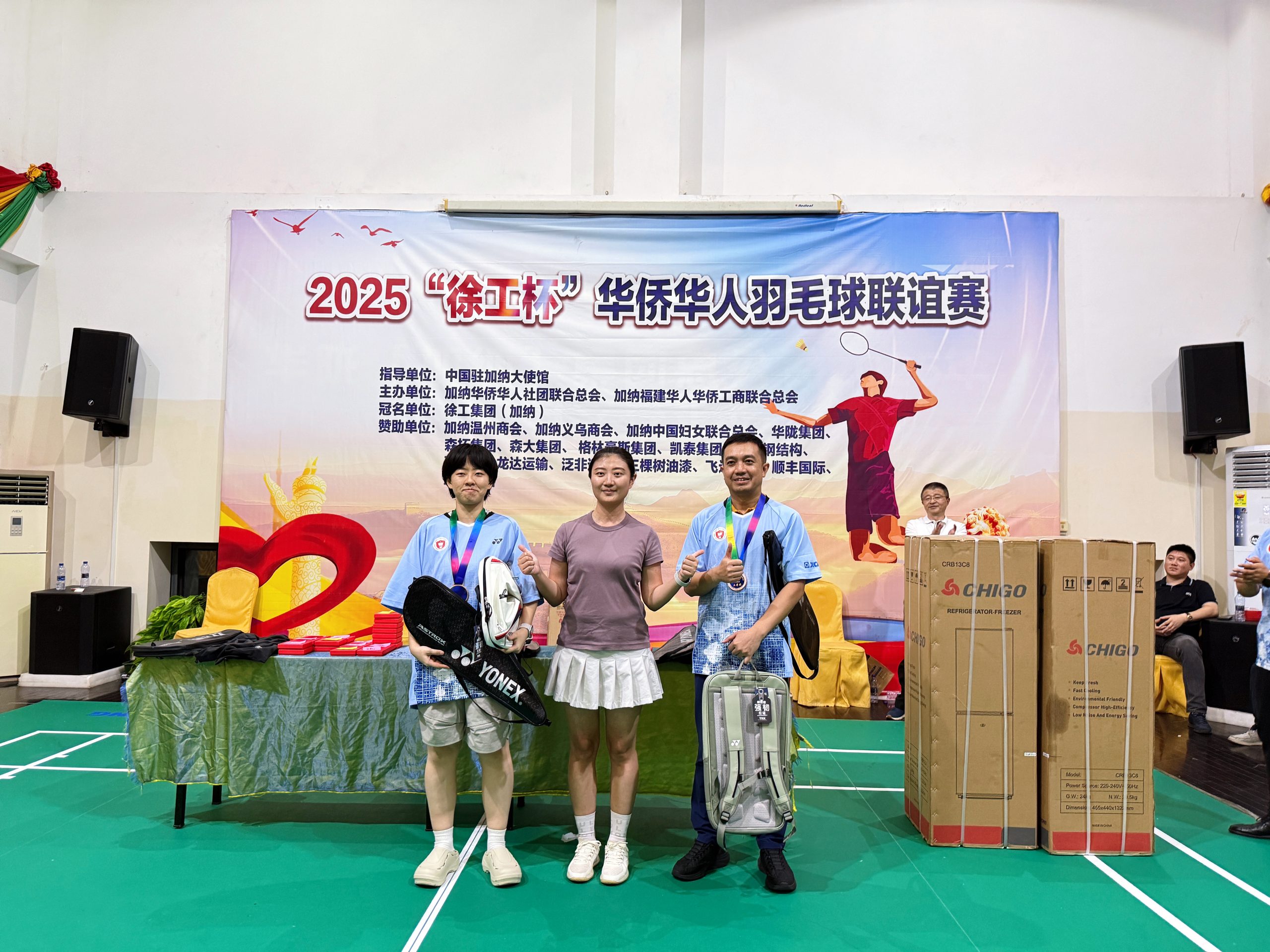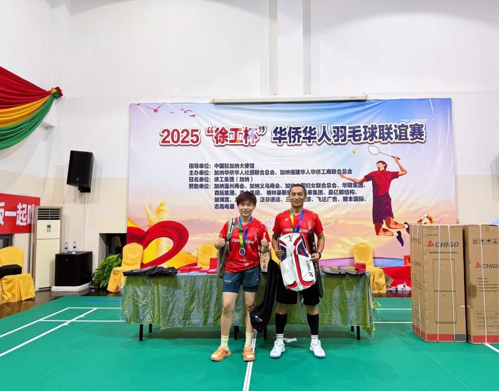 10月11日-12日,由中国驻加纳大使馆指导、加纳华侨华人社团联合总会、加纳福建华人华侨工商联合总会主办,徐工集团(加纳)冠名、其他加纳华人兄弟商会及众多侨商企业赞助的2025“徐工杯”华侨华人羽毛球联谊赛在GS Plaza Hotel成功举办。中国驻加纳使馆李旸代办,中国驻加纳使馆领事部宁军主任、加纳华侨华人社团联合总会会长唐宏,加纳福建华人华侨工商联合总会执行会长郑贤春、加纳华侨华人社团联合总会秘书长沈汉明、温州商会何妮峰、华陇(加纳)集团党总支书记、董事长、总经理贾龙、格林豪斯集团副总经理王成和、森拓钢铁周典敏、顺丰国际严松林、各企业代表队及羽毛球爱好者百余人参加比赛开幕式,中国驻加纳使馆闻付林参赞出席颁奖仪式。